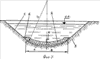 Сухой док сооружают следующим образом. При затоплении водой вычерпывают котлован 1, дно которого профилируют по радиусу дуги окружности (фиг.1), где В – ширина днища 2 котлована (фиг.2), подвергаемого подводному бетонированию с помощью подвижных трубчатых емкостей. Бетон укладывают на песчано-гравийный фильтр 6, выложенный равномерным слоем на цилиндрическом дне котлована 1. Края днища 2 наращивают до поверхности котлована 1 вертикальными бетонными стенками 3, далее ведут обратную засыпку стенок 3 после их бетонирования насухо, для чего воду из котлована 1 откачивают насосами 4 (фиг.3, 4).