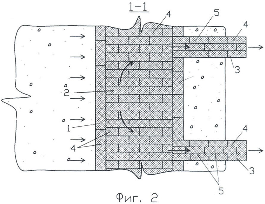 Указанная цель достигается тем, что горизонтальный дренаж земляных сооружений, состоящий из приемной, водосборной и отводящей частей, все эти конструктивные части дренажа выполнены из гибких тюфяков, состоящих из сетчатых оболочек и дренирующего заполнителя, который выполнен из плотных чередующих рядов легких фашин и перфорированных труб, завернутых в геосетку, при этом водоприемная часть дренажа выполнена из тюфяков, уложенных нормально к направлению фильтрационного потока, внутренняя водосборная часть дренажа – из тюфяков, уложенных послойно и по направлению фильтрационного потока, а отводящая часть выполнена из аналогичных тюфяков, но расположенных горизонтальными полосами в плане и на определенном расстоянии друг от друга по направлению фильтрационного потока и с уклоном от водосборной части до подошвы низового откоса, причем легкие фашины тюфяков выполнены диаметром 15-20 см и длиной 2-2,2 м из сухого созревшего камыша.