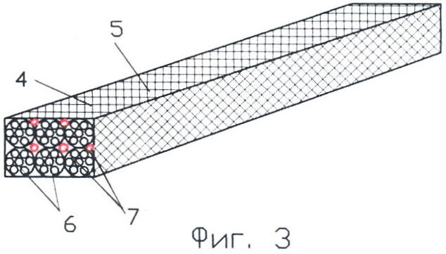 На фиг.1. изображено поперечное сечение земляной плотины с горизонтальным дренажом; на фиг.2. – план горизонтального разреза дренажа, сделанного по его середине; на фиг.3. – гибкий тюфяк, состоящий из сетчатой оболочки и дренирующего заполнителя, выполненный из легких фашин и гофрированных труб; на фиг.4. – легкая фашина из сухого камыша.