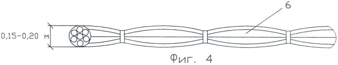 В конструкции дренажных тюфяков кроме перфорированных труб в качестве дренирующего материала используется сухой камыш – достаточно стойкий и прочный природный материал, который эффективно работает в условиях водной среды. Легкие фашины 6, завернутые в геосетку, образующие водоприемную часть 1 предотвращают фильтрационные деформации прилегающих грунтов. При этом исключается вынос и проникновение мелких частиц грунта в гибкие тюфяки 4, из-за использования геосетки. Таким образом, обеспечивается безопасный прием и отвод профильтровавшейся воды через тело земляных сооружений при всех возможных эксплуатационных уровнях воды в ВБ. Горизонтальный дренаж предлагаемой конструкции может эффективно работать без капитального ремонта 15-20 лет, в связи с тем, что сухой созревший камыш является высоко дренирующим и достаточно стойким материалом, который способен держаться в водной среде до 20 лет и более. Срок службы сухого камыша, используемого для изготовления легких фашин и тюфяков, можно продлить в два раза, если его обработать специальным раствором, повышающим водостойкость материала.