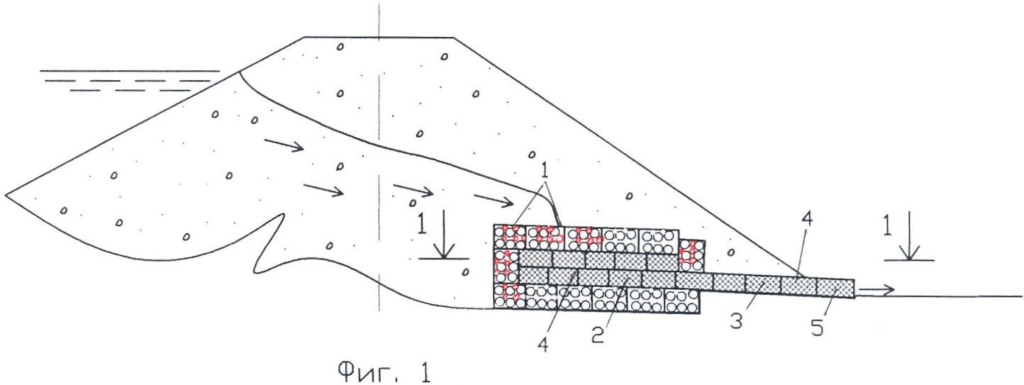 В период строительства (реконструкции) земляной плотины (или дамбы) в основание низового откоса, чуть выше дна НБ разрабатывают широкую траншею по габаритным размерам дренажа. По дну траншеи нормально к направлению фильтрационного потока по всей ширине плотными рядами раскладывают заранее заготовленные гибкие тюфяки 4 водоприемной части 1. Сверху горизонтальных рядов тюфяков 4 водоприемной части 1 по направлению фильтрационного потока укладывают в два слоя аналогичные тюфяки 4 водосборной части 2. Затем вокруг тюфяков 4 водосборной части 2 (по бокам и поверху) достраивают водоприемную часть из таких же тюфяков 4, но расположенных нормально к направлению фильтрационного потока. После этого от водосборной части 2 с уклоном (0,05) до нижнего бьефа (НБ) по направлению фильтрационного потока горизонтальными полосами укладывают такие же тюфяки 4 водоотводящей части 3. Ширина горизонтальных полос водоотводящей части 3 и расстояние между ними принимают из условия обеспечения свободного отвода профильтровавшейся воды через земляное сооружений.