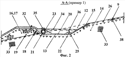 Основное отличие канала от описанного в примере 1 заключается в том, что все ложе канала расположено над дневной поверхностью 41 склона 9, т.е. над сезоннопротаивающим слоем 26. В таком канале низовой борт образован насыпью 42, верховой борт канала образован частично или полностью дневной поверхностью 41 склона 9, а обе трубы 21 и 22 расположены рядом и примыкают к насыпи 42.