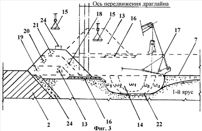 Разработку отходов в карьере 14 производят экскаватором драглайн 17 (фиг.3), который на каждом участке возведения дамбы наращивания 13, например, три раза передвигается на безопасном расстоянии от карьера 14 по дороге 16, выполненной из фильтрующего материала, преимущественно, из гравийного грунта, под верховой призмой 18, намеченной к возведению дамбой наращивания 13. Экскаватор драглайн 17 при каждом передвижении по дороге 16 последовательно разрабатывает заданную часть 1, 2, 3, карьера 14 и укладывает отходы в соответствующий слой 19, 20 и 21 дамбы наращивания 13. При завершающем (третьем) передвижении экскаватор драглайн 17 укладывает отходы на дорогу по схеме «под себя» и с обеспечением выпуска воды из отходов тела дамбы наращивания 13 по фильтрующему материалу дороги 16 в карьер 14. Ширина дороги 16 обеспечивает смещение экскаватора драглайн 17 в сторону карьера 14 на заданную величину при каждом его новом перемещении по дороге 16. Грунтовую воду 22 (фиг.3) из карьера 14 посредством насоса 23 (фиг.1) направляют в отстойный пруд 9, что обеспечивает понижение воды 22 в карьере 14, следовательно, и частичное обезвоживание разрабатываемых отходов.