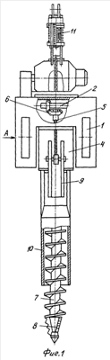 Разработанный грунт подается шнеком 7 в полость инвентарной трубы 10. Мощные толчки вибропогружателя 1 на забой забурником 8 значительно повышают интенсивность бурения и помогают успешно преодолевать твердые породы грунта при бурении и погружении инвентарной трубы 10 в целом. Подачу вибробура на забой при бурении регулируют путем натяжения канатов подвески подпружиненной траверсы 11. После погружения инвентарной трубы до проектной отметки включают гидрозахват 9 на открепление инвентарной трубы 10 и вынимают шнек 7 вместе с грунтом из полости инвентарной трубы 10.