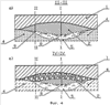 В поперечном направлении давление на слабые грунты 5 под каждой призмой 2, 3 изменяется от максимального значения в приподошвенной зоне 7 насыпи (Фиг.4а) до минимального – в приподошвенной зоне каждой призмы 2, 3 (Фиг.4б). Это обусловлено уменьшающейся длиной основания каждой призмы 2, 3 в этом направлении от максимального значения в приподошвенной зоне 7 насыпи до минимального – в приподошвенной зоне каждой призмы. В результате скальные грунты под каждой призмой 2, 3 опускаются в слабые грунты 5 на разную глубину по мере удаления от участка насыпи с максимальной осадкой 8 насыпи в сторону стабильных грунтов 4 и по мере удаления в продольном направлении от участка со стабильными грунтами 4 в сторону максимальной осадки 8.