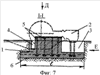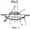 f=1-cos упр., rу.=Rсф.+рц. кр. – радиус эпюры контактных напряжений под центром сферы 6 и при заглублении сферы 6 в грунт и ее осадке (фиг.15) на глубину при этом горизонтальная опорная часть 7 плиты выполнена выступающей за края сферической опорной поверхности 6, либо оснащенной анкерными сваями 8.