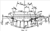 3. Устройство фундамента под машины, выполненное в виде массивной армированной железобетонной фундаментной плиты прямоугольной или призматической в плане формы, заглубленной в грунтовое основание на величину ее высоты, но не менее 1 м, гидроизолированной от вредного воздействия агрессивных грунтовых вод, с возможностью расположения центра тяжести машины и центра тяжести площади подошвы фундамента на одной вертикали, с площадью опорной поверхности, равной F={Eупр./[ко·Cz·(1-µо 2)]}2, где Еупр. – модуль упругости грунта, ко – коэффициент формы фундамента в плане, µo – коэффициент Пуассона грунта, Cz – коэффициент упругого равномерного сжатия, с выемками, шахтами и отверстиями и для размещения и крепления машины и обеспечения удобств при ее обслуживании, отличающееся тем, что прямоугольный в плане фундамент выполнен с опорной фундаментной плитой выпуклой сферической формы с радиусом , где d – диаметр отпечатка заглубленной сферы на поверхности углубленного грунта, – угол сектора упругого полуконтакта сферы с грунтом, – давление структурной прочности грунта на растяжение, – угол внутреннего трения и с – удельное сцепление грунта, – критическое давление под центром сферы, при этом горизонтальная опорная часть плиты выполнена выступающей за края сферической опорной поверхности, либо оснащенной анкерными сваями.