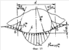 Способ сооружения фундамента под машины реализуется следующим образом. В грунте отрывают на высоты фундамента, но не менее 1 м, шурф прямоугольной в плане формы длиной (фиг.7, 8) и углубляют его дно по радиусу цилиндра 6 (фиг.6, 9) Rц.=в/(2·sin упр.), в – ширина отпечатка цилиндра, цилиндр 6 заглубляют на глубину S=(в/2) [(1-cos упр.)/sin упр.] при среднем допускаемом давлении на упругое грунтовое основание (фиг.14)