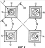 На фиг.2 представлено основание опоры, например мачты линии электропередачи сетчатого типа, содержащее четыре массивных блока 10 такого типа, как изображен на фиг.1, расположенных по квадрату вокруг опоры (не представлена). Опора жестко связана с основанием, причем каждый из массивных блоков выполняет функцию цоколя, к которому прикреплена несущая конструкция опоры. Как видно из фиг.1, массивный блок обычно содержит несколько уступов или ярусов, увеличивающихся сверху вниз так, что нижняя секция 12 массивного блока, также называемая подошвой, представляет собой секцию с наибольшим сечением в горизонтальной плоскости. В приведенном примере подошва 12 имеет форму усеченной пирамиды и расширяется книзу. Следует отметить, что в других типах массивных блоков, не представленных в настоящем описании, наибольшее горизонтальное сечение может иметь одна из промежуточных секций, отличная от нижней секции массивного блока.