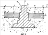 На фиг.5, 6 и 7 представлены еще три варианта осуществления усиливающего устройства по изобретению, в которых плита 20 представляет собой плиту из обработанного гравия. Однако данная плита также может быть изготовлена из смеси, аналогичной той, что использована в плите по фиг.3, или из смеси материалов, извлеченных из грунта места расположения основания, гравия и, по меньшей мере, одного вяжущего вещества. Плита 20 сцеплена с грунтом при помощи костылей 28, проходящих через нее по толщине. Костыли пересекают внешний край плиты 20, предпочтительно в той части плиты, которая выходит за пределы вертикальной проекции краев подошвы 12 массивного блока 10, и могут быть ориентированы вертикально, как показано на фиг.5, или наклонно, как показано на фиг.7. Длина костылей 28 может варьироваться, и, как показано на фиг.6, костыли 28 могут продолжаться ниже уровня расположения массивного блока 10.