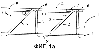 В зависимости от вида ожидаемой нагрузки закрепляющие элементы 7 могут быть размещены на всех верхних изгибах 6 или только на выбранных верхних изгибах 6. В продольном направлении решетчатой балки 1 между закрепляющими элементами 7 образованы свободные промежутки Z, которые согласно фиг.1а обеспечивают удобную укладку поперечных стержней 8 верхней арматуры, противодействующей растяжению при изгибе, на которые уложены продольные стержни 9 арматуры, противодействующей растяжению при изгибе. Продольные стержни 9 расположены между закрепляющими элементами 7 соседних балок 1. Расположение этой арматуры также может быть обратным, т.е. продольные стержни 9 могут быть расположены внизу, а на них могут быть расположены поперечные стержни 8. Равным образом может быть установлена многослойная арматура, противодействующая растяжению при изгибе. Независимо от толщины соответствующего слоя арматуры закрепляющие элементы 7 в этом варианте выполнения решетки расположены так, что их верхняя сторона оканчивается примерно там же, где и верхняя сторона изгиба 6. Однако верхняя сторона закрепляющего элемента 7 может в общем случае быть размещена в зоне между верхней и нижней сторонами изогнутого раскоса, образующего изгиб 6. Возможно и такое расположение, при котором верхняя сторона закрепляющего элемента 7 расположена в пределах зоны, проходящей выше верхней стороны и ниже нижней стороны изогнутого раскоса, образующего изгиб 6, соответственно на толщину изгиба 6.