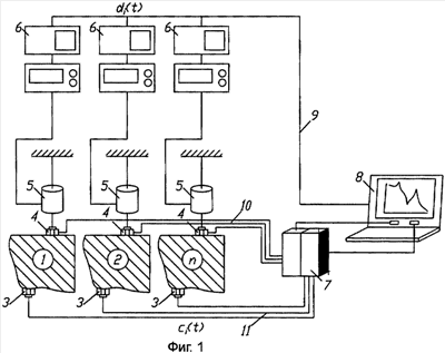 1, 2 – n – элементы конструкции здания или сооружения; 3 – акселерометр; 4 – датчик силы; 5 – источник динамической нагрузки (шейкер); 6 – генератор сигналов; 7 – блок усиления сигналов с АЦП; 8 – компьютер; 9 – кабельная линия управления генераторами сигналов; 10 – кабельная линия датчиков силы; 11 – кабельная линия акселерометров.