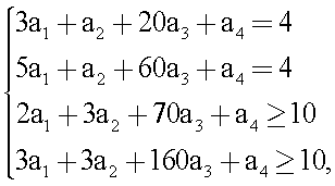 хi – усредненные значения параметров (х1=2,5; х2=3; х3=115; x4=1), соответствующие выбранной минимизируемой функции отклика y при решении основной задачи линейного программирования по следующей системе неравенств: