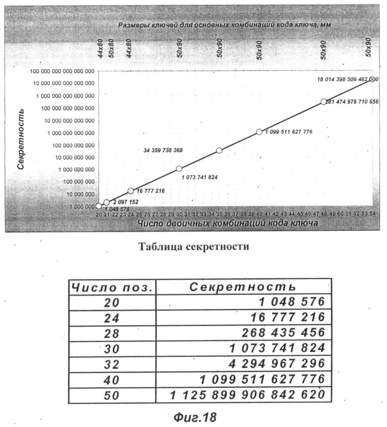 На фиг.18 изображена диаграмма для определения секретности замков с ключом-перфокартой для различного числа комбинаций кода ключа к магнитокодовым замкам механического действия и соответствующая ей таблица зависимостей числа максимальных комбинаций двоичного кода (секретности) от числа перфораций ключа-перфокарты.