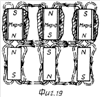 На фиг.20 изображена схема взаимодействия градиентов магнитных потоков при параллельном включении одноименными полюсами.