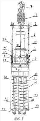 Подвеска 4 устройства состоит из траверсы 16, амортизатора 17 с серьгой 18 и штанг 19, соединяющих корпус редуктора 3 с траверсой 16. Цилиндрическая ограждающая рубашка 5, в полости которой помещены шнеки 13 и 14, в нижней части имеет наклонные козырьки 20 клиновидной формы, она находится в скользящем зацеплении со штангами 19 и подпружинена пружинами 21, надетыми на штанги 19, с возможностью перемещения по ним. Перемещение рубашки 5 по штангам 19 ограничено упорами 22, закрепляемыми на штангах 19, в местах, обозначенных отверстиями 23.