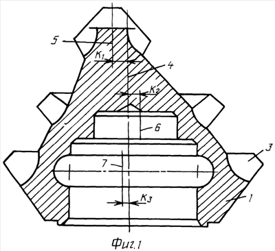 Шарошка бурового долота содержит корпус 1 с венцами 2, оснащенными породоразрушающими элементами 3. В случае использования фрезерованных зубьев для этой цели используется твердосплавная армировка. В других случаях в качестве породоразрушающих элементов используются твердосплавные зубки (не показаны). Венцы 2 шарошки выполнены с эксцентриситетом К относительно продольной оси 4 шарошки, при этом величина эксцентриситета венцов 2 уменьшается в направлении от вершины к периферии, т.е. K1>К2>К3. Величину эксцентриситета осей 5, 6 и 7 у первых трех венцов предпочтительно выбрать в соответствии с соотношением K1:K2:К3=3: 2:1.