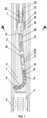 После этого производят срыв якорного узла 4 и установку корпуса 2 в новое положение в интервале перфорации пласта с повторением всех технологических операций, описанных выше.