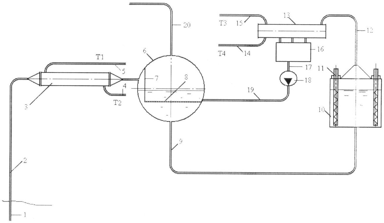 Нижнюю точку емкости 6 посредством трубопровода 9 соединяют с испарителем 10, снабженным сменными нагревательными элементами 11. Паровое пространство осадителя 10 трубопроводом 12 соединяют с конденсатором 13, включенным в систему горячего водоснабжения трубопроводами 14 (Т4) и 15 (Т3). Выходной патрубок конденсатора 13 связан с конденсатным баком 16, который, в свою очередь, трубопроводами 17 и 19 с насосом 18 связан с водным объемом горизонтальной емкости 6.
