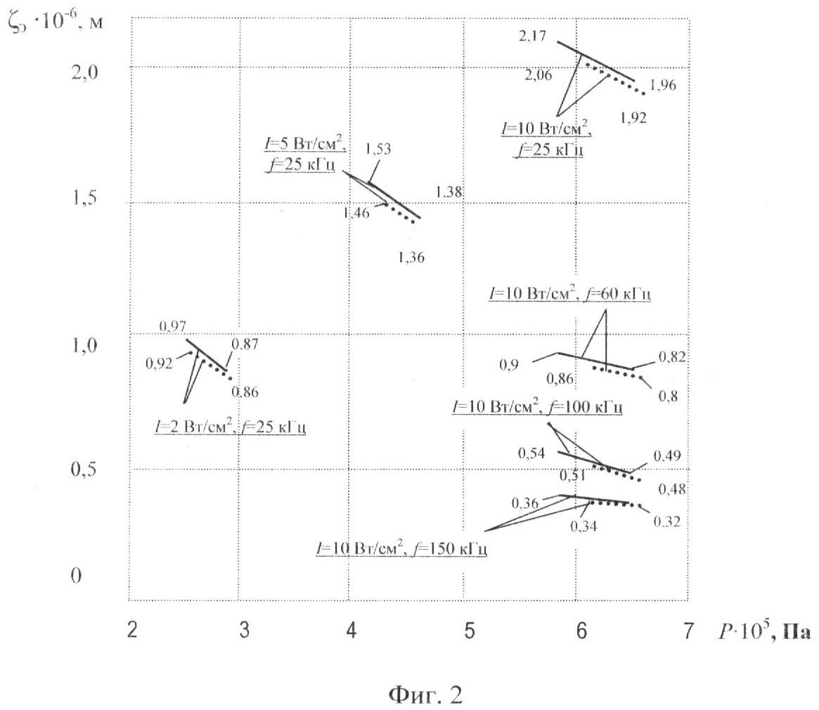 На фиг.1 – общий вид системы разработки россыпи, обеспечивающий выполнение способа; на фиг.2 – полученные расчетным путем графические зависимости амплитуды смещения частиц гидросмеси в звуковой волне от давления ультразвука P, колебательное смещение частиц гидросмеси при соотношении твердого к жидкому Т:Ж как: 3:7 – показано точками и 6:4 показано сплошной линией __.