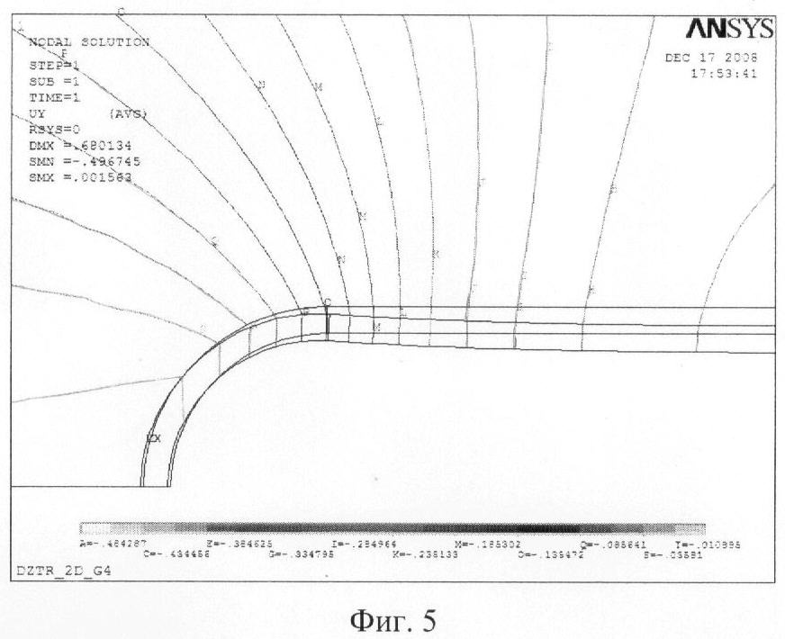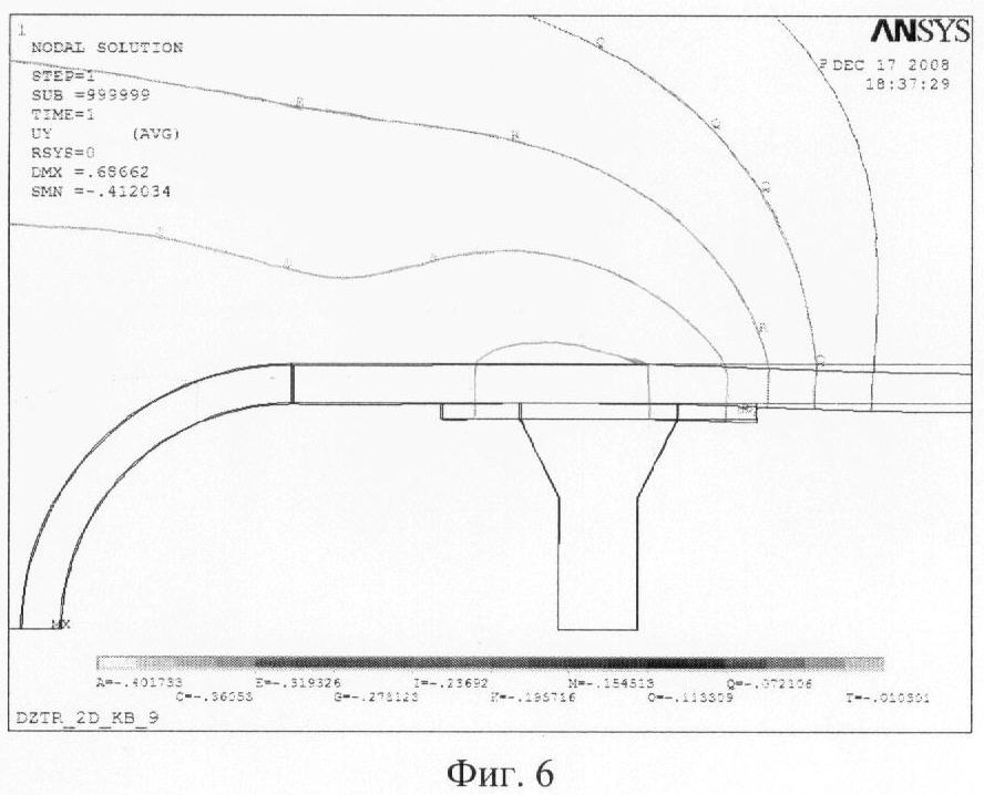 На фиг.5 и 6 приведены поля смещений приконтурного массива и крепи без бетонной перегородки и с ней.