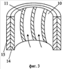 На фиг.1 показана принципиальная схема устройства для борьбы с туманом на рудниках; на фиг.2 – биметаллический патрубок выхода подогретого воздуха с направляющими, расположенными по отрицательному вращению винтовой линии, на фиг.3 – биметаллический патрубок выхода подогретого воздуха с направляющими, расположенными по положительному вращению винтовой линии.