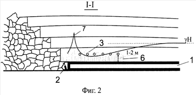Сущность изобретения поясняется примером его выполнения и чертежами, где на фиг.1 показан выемочный участок в плане, а на фиг.2 – разрез по I-I на фиг.1.