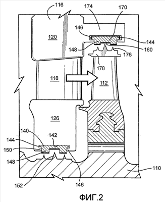 На фиг.2 для обозначения деталей, подобных показанным на фиг.1, использованы аналогичные ссылочные позиции, спереди к которым добавлена цифра 1. Показанный на фиг.2 носитель 140 уплотнения имеет конфигурацию ласточкина хвоста для размещения в канавке 142, имеющей в целом сопрягаемую конфигурацию ласточкина хвоста, выполненную вдоль внутреннего диаметра внутреннего кольца 126 диафрагмы. Таким образом, как показано на фиг.2 и 5, носитель 140 уплотнения включает пару выступающих в противоположных направлениях выступов 144 для размещения в соответствующих разнесенных в осевом направлении канавках 146 внутреннего кольца 126 диафрагмы. Носитель 140 уплотнения имеет суженную часть 148, которая выступает между внутренними выступами 150 диафрагмы радиально внутрь, к вращающемуся компоненту, например, к ротору 110. Как показано, вращающийся компонент включает множество уплотнительных зубцов 152. Как лучше видно на фиг.5, обращенные радиально внутрь уплотнительные поверхности носителя 140 уплотнения покрыты истираемым материалом 160. Истираемый материал 160 может быть материалом типа, описанного и показанного в патенте США 6547522, принадлежащего настоящему заявителю, описание которого включено сюда посредством ссылки. Таким образом, истираемый материал может содержать состав, имеющий первый компонент, включающий кобальт, никель, хромистый иттрий, и второй компонент, выбранный из группы, состоящей из гексагонального нитрида бора и полимера. Согласно настоящему изобретению также можно использовать любой из дополнительных истираемых материалов, описанных в патенте США 6547522.