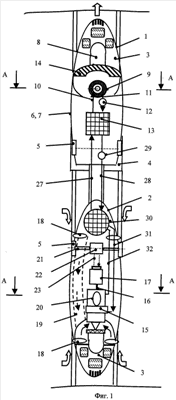 В газотурбинной секции 2 находится газотурбинный привод 15, соединенный валом привода 16 с тяговым генератором 17. С обеих сторон газотурбинной секции 2 выполнены воздухозаборники 18, которые воздухоподводящими каналами 19 соединены с входом в газотурбинный привод 15. На газотурбинной секции 2 на ее крыше 8 установлена выхлопная труба 20. Колесные пары 5 соединены валами 21 с электродвигателями 22. Тяговый генератор соединен электрическими связями 23 с тяговыми электродвигателями 22. Секции 1 и 2 соединены трубопроводами рециркуляции второго контура 27 и 28, в одном из которых установлен насос 29 с теплообменником второго контура 30. Теплообменник второго контура 30 соединен трубопроводами перепуска воздуха 31 и 32 с газотурбинным приводом 17.