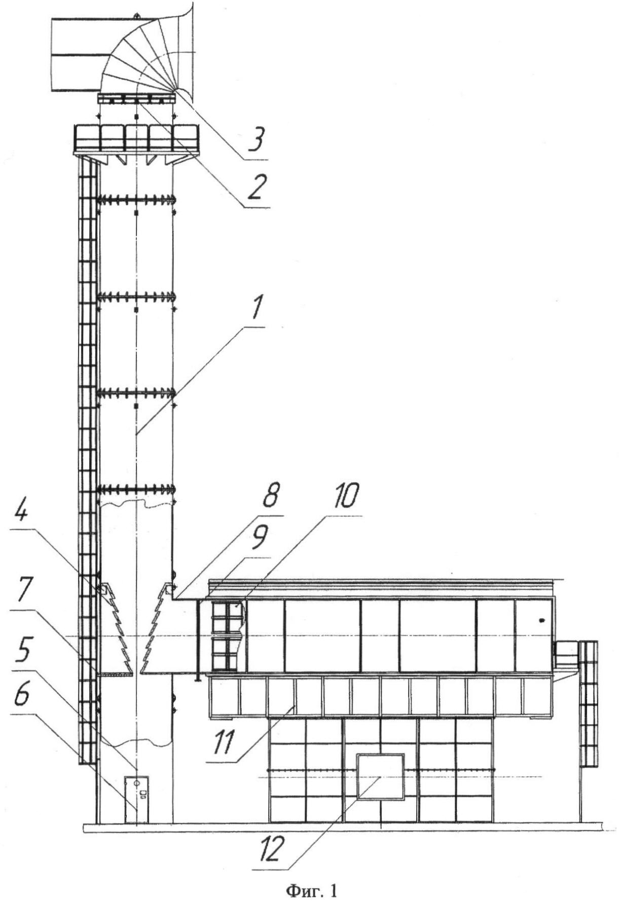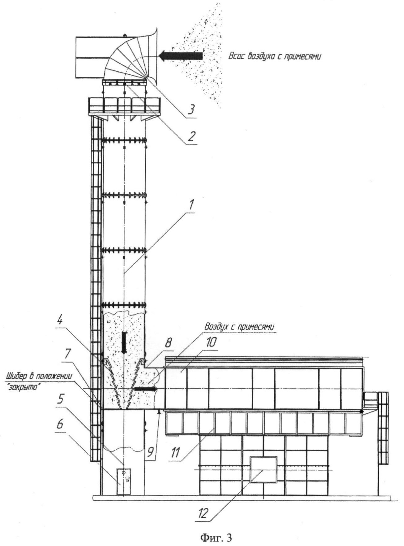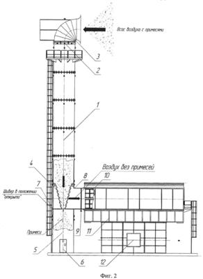 Атмосферный воздух поступает в трубу 1 через самоустанавливающийся воздухозаборник 3 с высоты, большей, чем в аналоге, что является искусственным способом очистки (на большей высоте содержится меньшее количество примесей). Самоустанавливающийся воздухозаборник 3, расположенный на опорно-поворотном механизме 2, выполнен аналогично конструкции флюгера – его воздухоприемное отверстие всегда направлено навстречу ветру, что позволяет снизить гидравлическое сопротивление в тракте всаса и, соответственно, повысить КПД ГТД. Далее воздух поступает в инерционный пылеуловитель 4. Под действием сил инерции примеси скатываются по стенкам пылеуловителя 4 в пылесборную камеру 5, а очищенный воздух через щели в инерционном пылеуловителе 4 идет по воздуховодам 8, подогревается системой подогрева циклового воздуха 9 и подается на воздушные фильтры 10, расположенные в воздухоприемной камере 11, и далее – в тракт всаса двигателя 12.