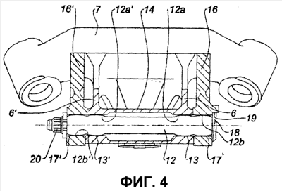 Внутренние выпуклые поверхности втулок 21а, 21b, 21a’, 21b’ предпочтительно являются сферическими, т.е. каждая получена из образующей линии в виде дуги окружности, и все их радиусы кривизны здесь идентичны и равны приблизительно 300 мм, причем диаметр стержня 12 составляет 15 мм. Следует отметить, что фиг.5 изображена не в масштабе для облегчения понимания.