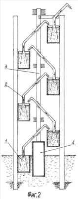 Все конуса 2 жестко связаны с несущей штангой 3, которая, в свою очередь, опирается на понтон – поплавок 4, совершающий возвратно-поступательное движение вверх-вниз под воздействием прибойной волны, обеспечивая тем самым движение всех конусов 2 вверх-вниз относительно неподвижных корпусов емкостей 1. При этом при движении конусов 2 вниз, происходит фонтанирование воды из узких концов конусов 2 и переброс ее вверх, в последующую соседнюю, вышерасположенную емкость 1. Из последней, верхней, емкости 1 вода самотеком подается в аккумулирующий воду резервуар, откуда она сбрасывается на рабочий орган гидротурбины.