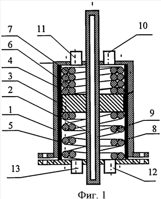 На фиг.1 и 2 показан термомеханический силопривод в верхнем (фиг.1) и в нижнем положениях (фиг.2). Термомеханический силопривод состоит из корпуса 1, в котором расположен шток 2 с поршнем 3, делящим корпус 1 на две камеры. В камере 4 установлена пружин 6 большего и пружина 7 меньшего диаметра, расположенная в пружине 6, обе пружины при комнатной температуре находятся в сжатом состоянии. В камере 5, аналогично, расположены пружина 8 большего диаметра и пружина 9 меньшего диаметра, при комнатной температуре находящиеся в растянутом состоянии. В камере 4 расположены электромагнитные клапаны 10 и 11 для пуска и выпуска горячей и холодной жидкости, например воды, в камере 5 установлены электромагнитные клапаны 12 и 13 для впуска и выпуска горячей или холодной жидкости, например воды. Пружины выполнены из нитинола. Если для мартенситных превращений в применяемой проволоке из нитинола титана достаточно температуры до 100°С, то в качестве жидкости можно применять воду. При более высоких температурах необходимо применять солевые растворы.