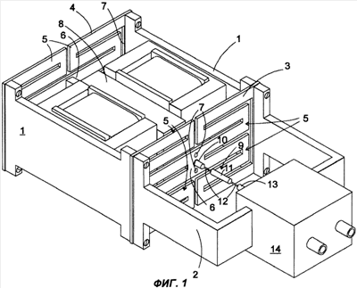 Два электромагнита с Е-образными сердечниками и с секциями обмотки, намотанными вокруг средней перекладины буквы «Е», расположены соответственно между колеблющимся телом 8 и стенками 1, обращены полюсными наконечниками к колеблющемуся телу 8 и служат для приведения колеблющегося тела 8 в колебательное движение.