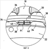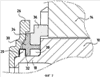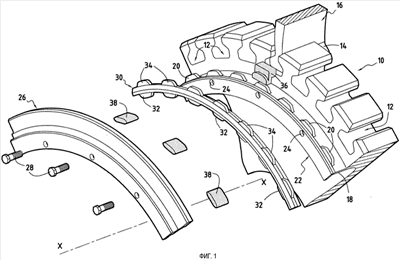 Под действием центробежной силы, вызванной вращением диска 10, поверхности 40 контакта опорного элемента 38, выполненного из эластомерного материала, деформируются и прижимаются к стопорному кольцу 30 и фланцу 18 диска, тесно соответствуя их контурам. На фиг. 6 эта деформация поверхностей 40 контакта показана стрелками F1.