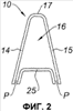 На фиг.1 и в разрезе на фиг.2 показана стойка 10 пламестабилизатора, используемого в системе дожигания турбореактивного двигателя. Эту стойку выполняют из композитного материала, что раскрыто в патентной заявке FR 0400651, поданной на имя заявителя. Композитный материал типа ККМ (композит с керамической матрицей) позволяет выполнять моноблочную конструкцию в данном случае V-образной формы с двумя стенками 14 и 15, расходящимися, начиная от кромки 17. Стойка содержит два фланца 20 и 22 крепления к наружному картеру канала дожигания. Удлиненная полость 16, выполненная между двумя стенками и обращенная в сторону выхода канала, служит для подачи смеси воздух-горючее в первичный контур. Капот или экран 25, показанный отдельно на фиг.1, частично закрывает полость 16, оставляя при этом периферическое пространство Р, через которое горючая смесь впрыскивается в газовоздушный контур.