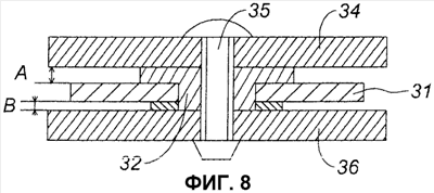 На фиг.7 и 8 показан вариант осуществления настоящего изобретения в рамках другого использования. В данном случае речь идет о соединении первой детали 31 со второй 34 и третьей 36 деталями. Соединение между первой деталью 31 и второй деталью 34 осуществляют по размеру А, а соединение между первой деталью и третьей деталью 36 – по размеру В. Для этого используют вставку 32, цилиндрическая часть 32А и часть с заплечиком 32В которой имеют утолщение, достаточное для осуществления механической обработки до необходимого размера А и В соответственно. Все три детали соединяют при помощи одной заклепки.