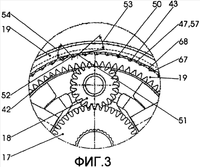 На фиг.2 в разрезе штриховой линией обозначены венцы 43, 47, а на фиг.3 сплошной линией – венцы 43′, 47′. Венцы с обеих сторон идентичны друг другу и зеркально перевернуты друг относительно друга. Поэтому описаны только венцы 43, 47. Направленные внутрь соединительные зубья 50 венца 43 имеют в перпендикулярном оси сечении пилообразную форму и состоят из пологой 51 и крутой 52 боковых сторон. Первая образует с касательной к ее делительной окружности угол 53 примерно 25-30°, а вторая – угол 54 примерно 45-62°. Направленные наружу соединительные зубья 57 зубчатого кольца 46 имеют тот же контур. Они имеют пологую 67 и крутую 68 боковые стороны.