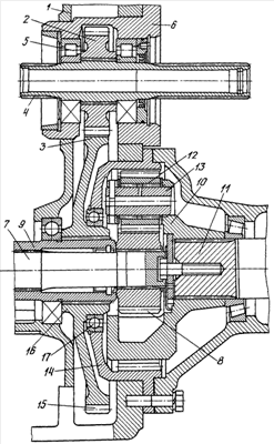 В корпусе заднего моста 1 размещена зубчатая цилиндрическая передача, включающая ведущую 2 и ведомую 3 шестерни.