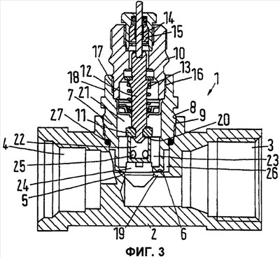 Между вставкой 7 и корпусом 2 клапана также может быть предусмотрено кольцевое уплотнение 27, показанное схематично. Могут также использоваться дополнительные уплотнения, не показанные на чертежах по соображениям наглядности иллюстрации конструкции клапана.