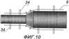 Прошедшие дробеструйную обработку, раскрой и сварку с переходной деталью патрубки 3 рабочих труб перехода, образующие переход рабочих труб 6, размещают на стапелях (не показано) и осуществляют установку на них пластиковых или металлопластиковых центраторов 34, в технологические отверстия которых пропускают для труб диаметром до 426 мм включительно, по меньшей мере, два провода 8 системы оперативного дистанционного контроля (СОДК) – проводников-индикаторов, причем концы проводов закрепляют на торцах перехода рабочих труб 6, после чего производят совмещение осей готовой гидроизоляции 5 – трубы-оболочки в виде трубы-оболочки составной формы, или заготовок трубы-оболочки для гидроизоляции составной формы и перехода рабочих труб, после чего осуществляют надвиг гидроизоляции 5 на переход рабочих труб 6 с образованием конструкции труба в трубе.