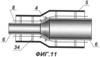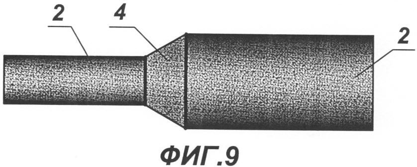 на фиг.9 – патрубки рабочих труб перехода, прошедшие дробеструйную обработку, раскрой и сварку с переходной деталью, вид сбоку;