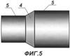 на фиг.5 – гидроизоляция в виде оболочки составной формы, условно подобной по форме переходу рабочих труб из полимерного или полимерсодержащего материала, вид сбоку;