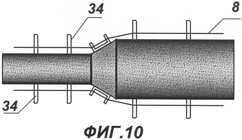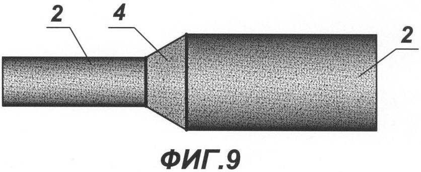 на фиг.9 патрубки рабочих труб перехода, прошедшие дробеструйную обработку, раскрой и сварку с переходной деталью, вид сбоку;
