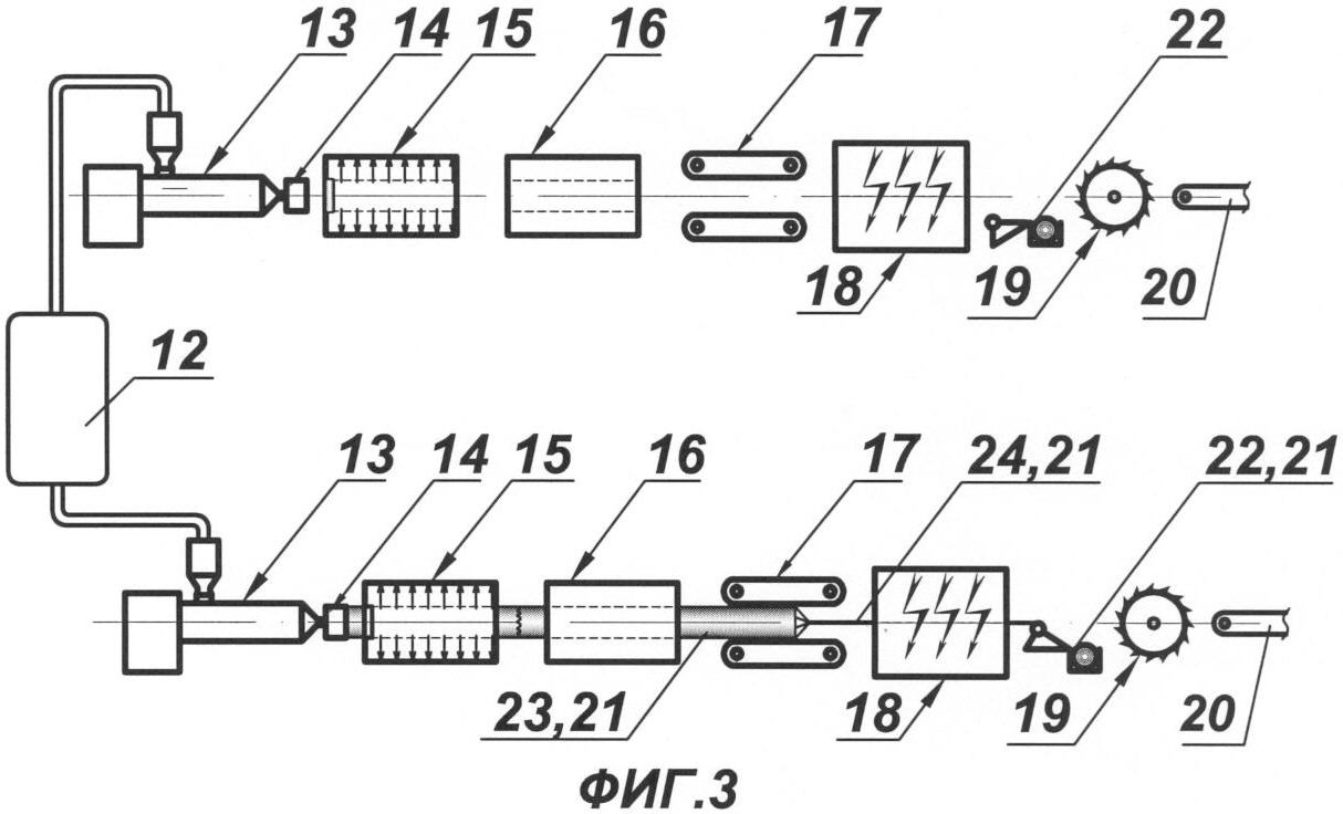 4. Способ по п.2, отличающийся тем, что перед подачей полимерных гранул на пост разогрева и экструдирования производят их сушку, совмещенную с предварительным разогревом, разогрев на посту разогрева и экструдирования производят до температуры плавления исходного материала, экструдирование под избыточным давлением совмещают с первичным формованием, а на посту формования и калибровки трубу-оболочку подвергают вакуумному трехосному растяжению с одновременным охлаждением преимущественно водой, затем изделие подвергают принудительному охлаждению и одноосному растяжению на отрезке от поста калибровки до поста протяжных устройств включительно, после чего производят коронную электроискровую обработку внутренней поверхности заготовки трубы-оболочки разрядом мощностью 90-135 Вт до значения поверхностного натяжения не менее 50 дин/см2, предпочтительно, двойную коронную электроискровую обработку за счет выполнения одного из электродов – внешнего в виде охватывающего трубу пояса с шириной 140-160 мм и резку заготовки трубы-оболочки под заданный размер и перемещение ее по выходному конвейеру.