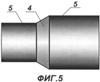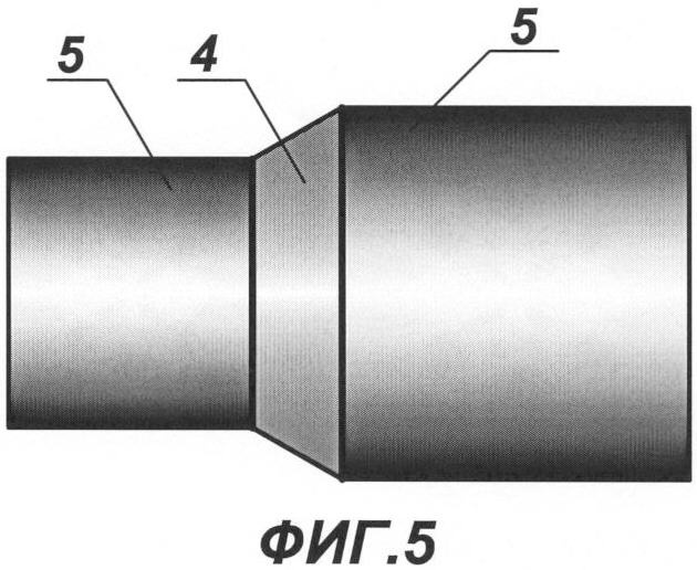 на фиг.5 – гидроизоляция в виде оболочки составной формы, условно подобной по форме переходу рабочих труб из полимерного или полимерсодержащего материала, вид сбоку;