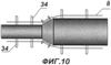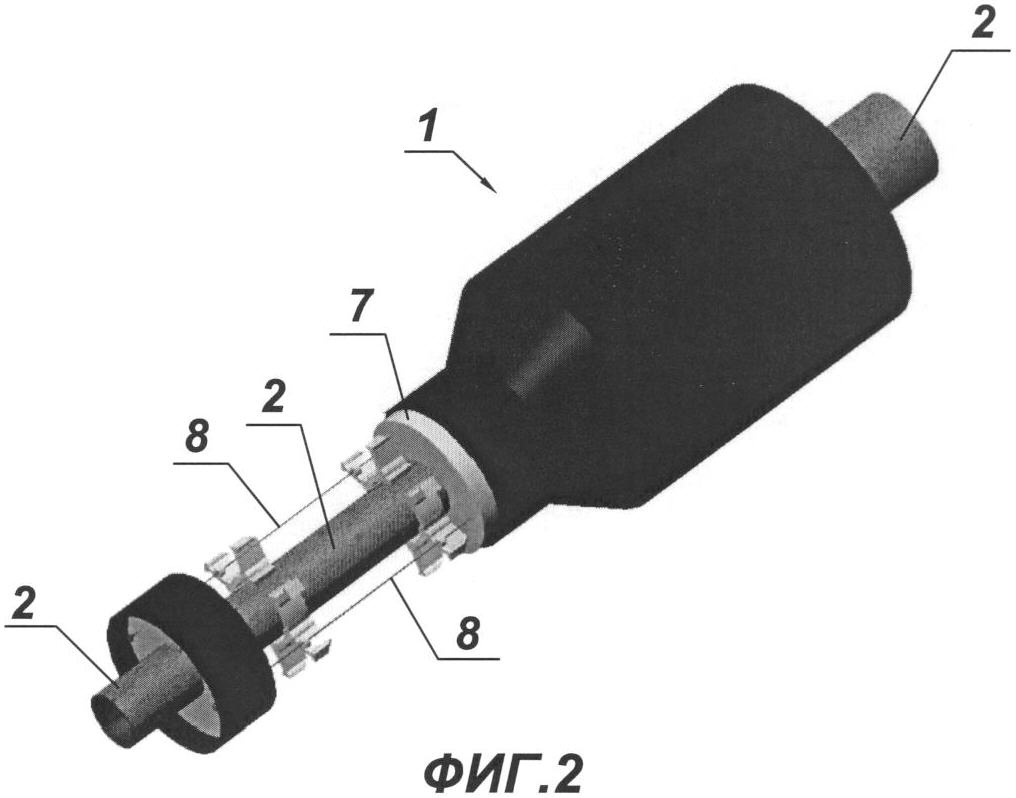 Прошедшие дробеструйную обработку, раскрой и сварку с переходной деталью патрубки 3 рабочих труб перехода, образующие переход рабочих труб 6, размещают на стапелях (не показано) и осуществляют установку на них пластиковых или металло-пластиковых центраторов 34, в технологические отверстия которых пропускают для труб диаметром до 426 мм включительно, по меньшей мере, два провода 8 системы оперативного дистанционного контроля (СОДК) – проводников-индикаторов, причем концы проводов закрепляют на торцах перехода рабочих труб 6, после чего производят совмещение осей готовой гидроизоляции 5 – трубы-оболочки в виде трубы-оболочки составной формы, или заготовок трубы-оболочки для гидроизоляции составной формы и перехода рабочих труб, после чего осуществляют надвиг гидроизоляции 5 на переход рабочих труб 6 с образованием конструкции труба в трубе.