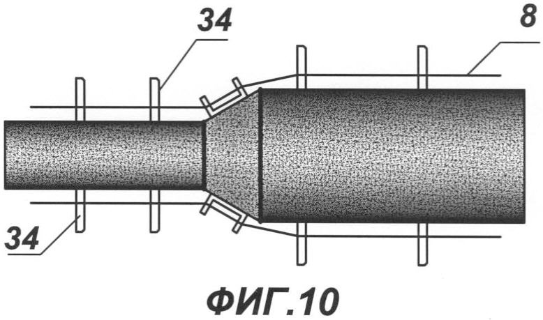 на фиг.9 патрубки рабочих труб перехода, прошедшие дробеструйную обработку, раскрой и сварку с переходной деталью, вид сбоку;