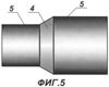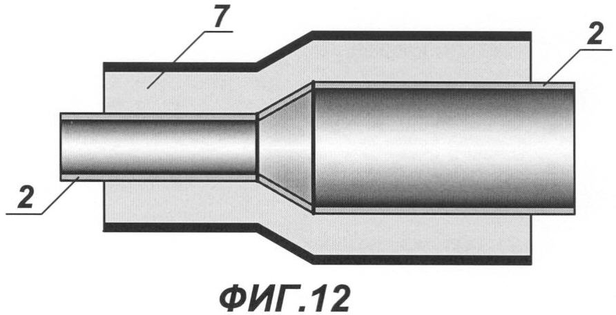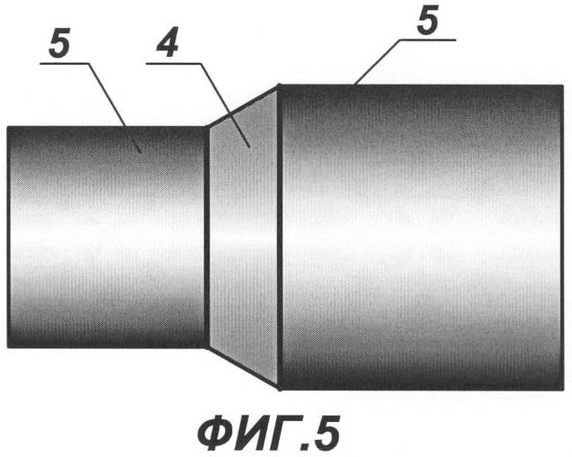 на фиг.5 – гидроизоляция в виде оболочки составной формы, условно подобной по форме переходу рабочих труб из полимерного или полимерсодержащего материала, вид сбоку;