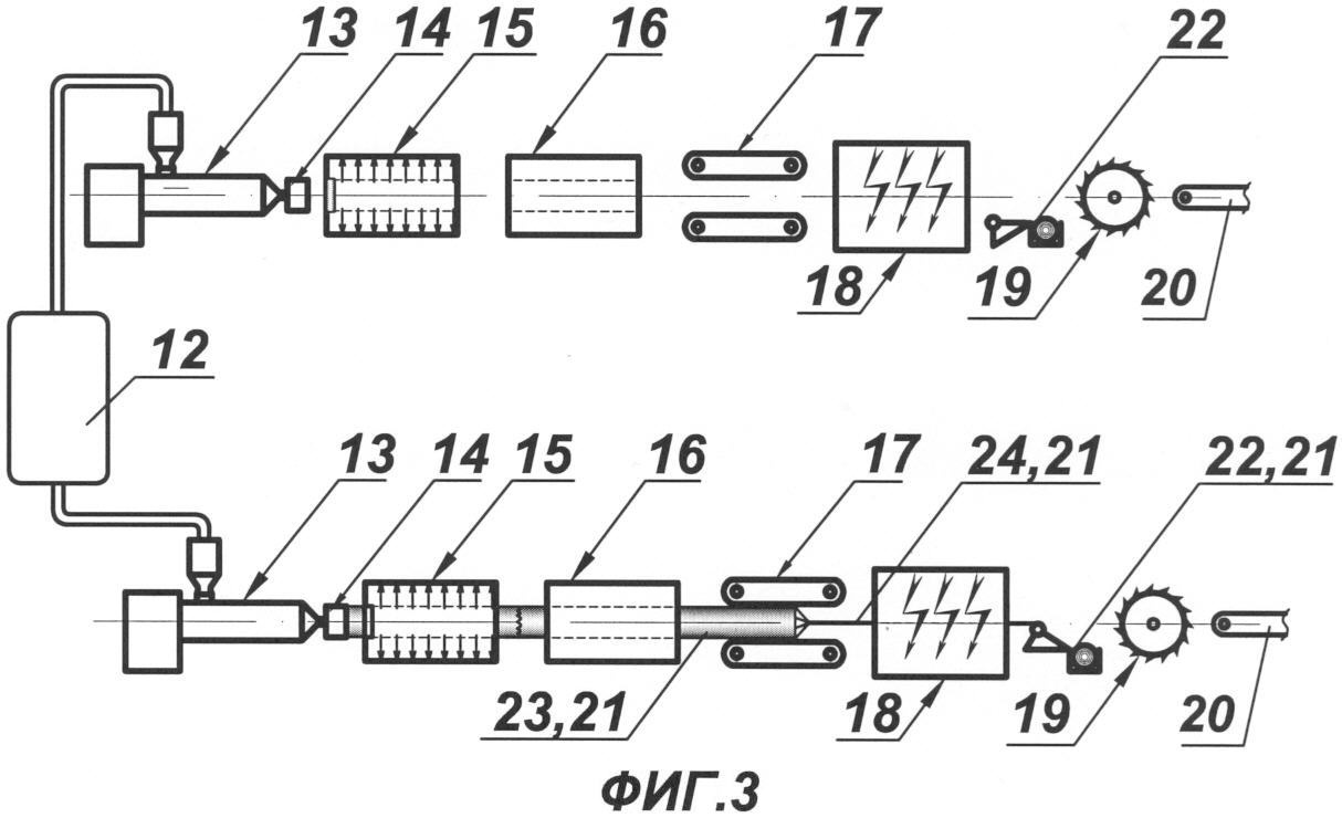 Каждый из перечисленных постов технологической линии снабжают технологическим оборудованием, выполненным с возможностью автоматического и/или корректируемого достижения динамического баланса пропускаемой через оборудование постов массы производимого изделия, варьирования температуры и скорости прохождения до значений, необходимых и достаточных для формирования, поддержания и стабилизации требуемых параметров у расчетного спектра изготавливаемых труб-оболочек или заготовок труб-оболочек, предусмотренных для производства на технологической линии, в том числе знакопеременного диапазона давлений в массе производимого изделия на различных технологических постах от избыточного давления на посту 13 экструдирования до трехосного растяжения на посту 14 формования и калибровки и одноосного растяжения на отрезке от поста 14 калибровки до поста 17 протяжных устройств включительно, для чего пост 13 разогрева и экструдирования полимерной массы снабжают сменным раздаточным устройством с выходной щелью, адаптированной к функции подготовки к формованию расплавленной полимерной массы под геометрические параметры производимой заготовки трубы-оболочки, а пост 14 формования и калибровки изделия снабжают калибрующим устройством, совмещенным с системами вакуумирования и охлаждения, сменно адаптируемым под выпуск конкретного изделия в спектре, предусмотренном для производства на линии.